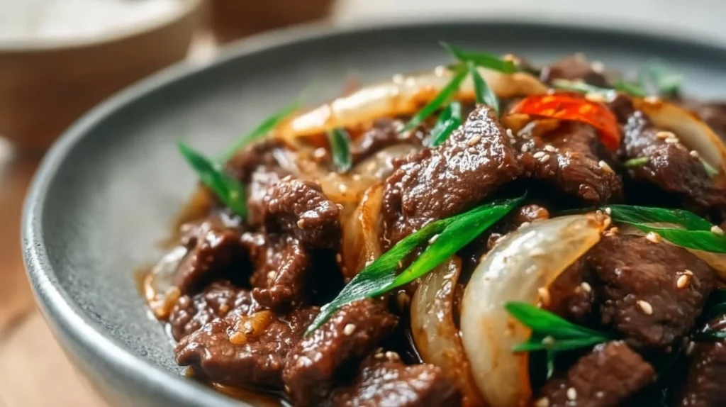 Ce plat ne se contente pas d’être délicieux, il offre également une expérience sensorielle appréciable. La tendresse du bœuf fond facilement en bouche, tandis que les oignons caramélisés apportent une douceur irrésistible. La sauce soja, avec ses nuances salées et umami, enveloppe le tout de manière harmonieuse. Chaque bouchée révèle une combinaison de textures, du croquant des oignons à la fondant de la viande. L’ajout de persil frais à la fin n’est pas qu’esthétique, il apporte également une note herbale agréable qui équilibre les saveurs riches du plat.
